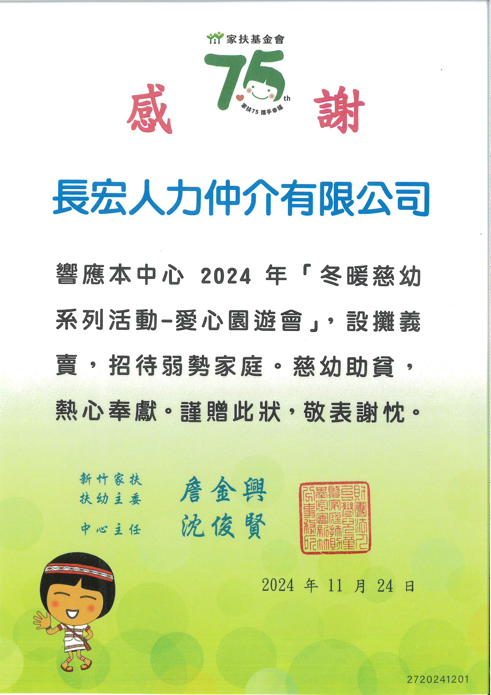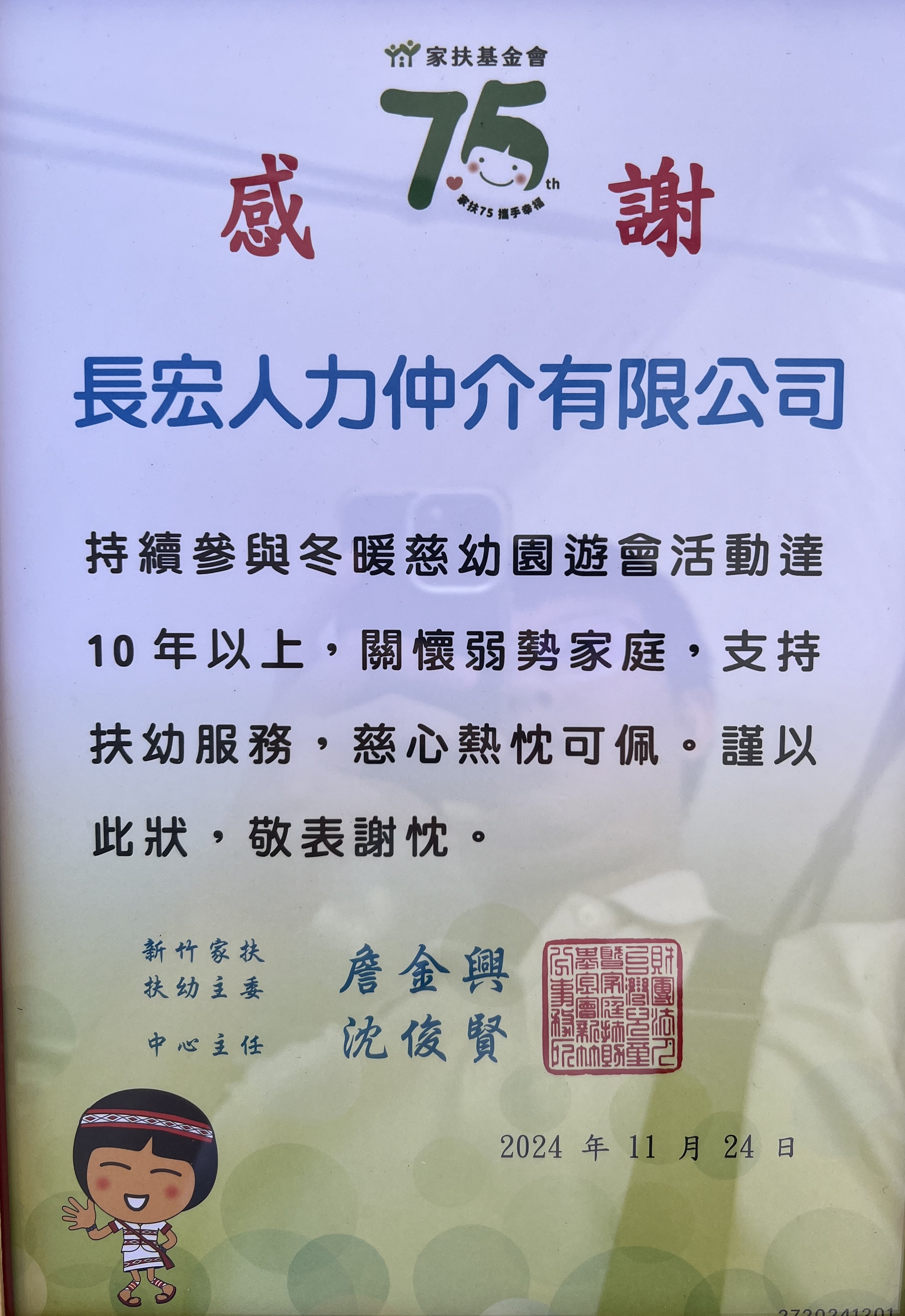 長宏人力深耕公益,持續以實際行動關懷弱勢家庭。根據活動紀錄,新竹家扶中心特別感謝長宏人力近 9 年來持續支持冬暖園遊會,今年的參與標誌著其善行已邁入第 10 年,因此特別頒發了「設攤感謝狀」與「持續參與 10 年以上感謝狀」兩項殊榮。
